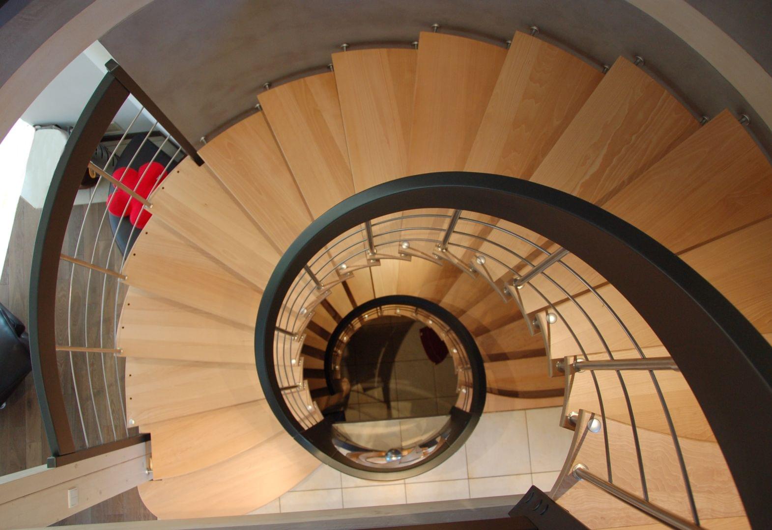 Escaliers colimaçon avec marches en bois.